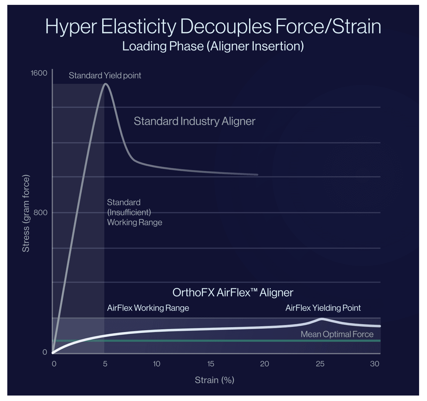 With industry aligners, very little strain (5%) results in excessive stress that is greater by 20x the optimal force. With AirFlex™ aligners, stress and strain have been decoupled, resulting in strain control within the working range without increasing stress. AirFlex exerts 8.4x less force than other aligner brands.*