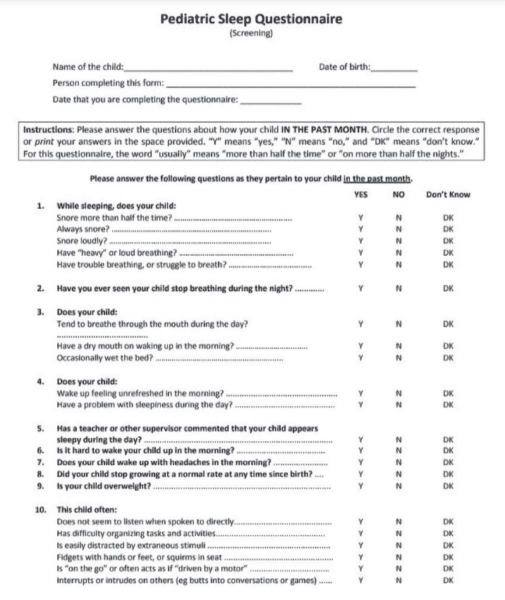 The validated Pediatric Sleep Questionnaire (PSQ) is the most utilized screening tool. It emphasizes snoring intensity and frequency, witnessed apnea, mouth breathing, daytime fatigue, bed wetting, morning headaches, low growth, and attention deficit symptoms (Figure 1).