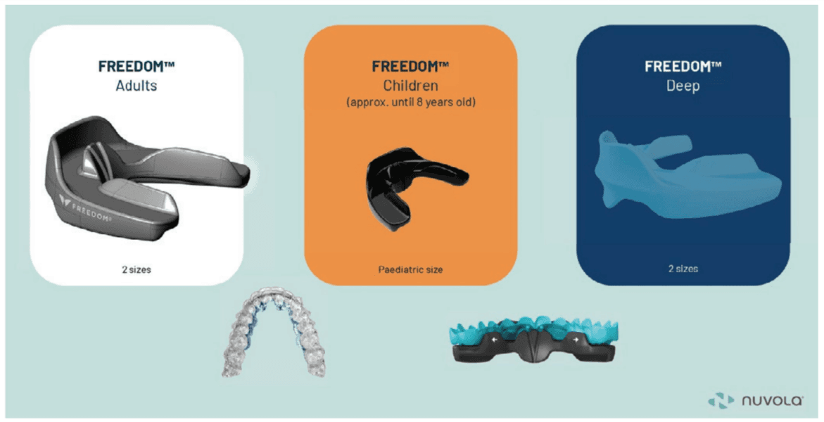 A new technique to North America, incorporating orthopedic development of the maxilla in combination with aligner therapy, is called Nuvola (BioMax). It was developed in Italy by Dr. Alessandro Carrafiello, an orthodontist/physician with remarkable treatment outcomes for both adults and children. Children as young as 5 can benefit from this treatment. This treatment utilizes a chewable oral device (Freedom appliance) that is used for only 30 minutes per day. The Freedom device comes in three types: regular, deep bite, and pediatric (Nuvola Jr). This device uses piezoelectric forces to develop the maxilla and mandible in combination with reinforced aligners, without the need for fixed appliances (Figure 19). It is tremendously easy to implement for practitioners and patients. Compliance is much higher than in previous treatments for malocclusion. There are currently no studies on how effective this treatment is for POSA; however, it looks promising.