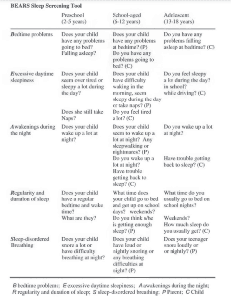 The BEARS Sleep Screening Tool developed by Judith Owens, MD (Director of Sleep Medicine, Center for Pediatric Sleep Disorders, Department of Neurology, Children’s Hospital Boston, Professor of Neurology Harvard University), divides symptoms of bedtime problems, excessive daytime sleepiness, awakenings during the night, regularity and duration of sleep, and sleep-disordered breathing by three age groups. The three age groups are around 2-5 years, 6-12 years, and 13-18 years (Figure 2).