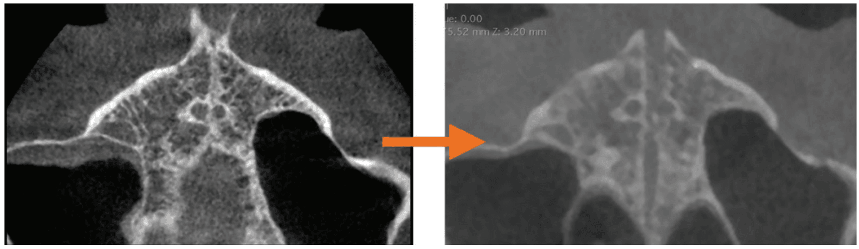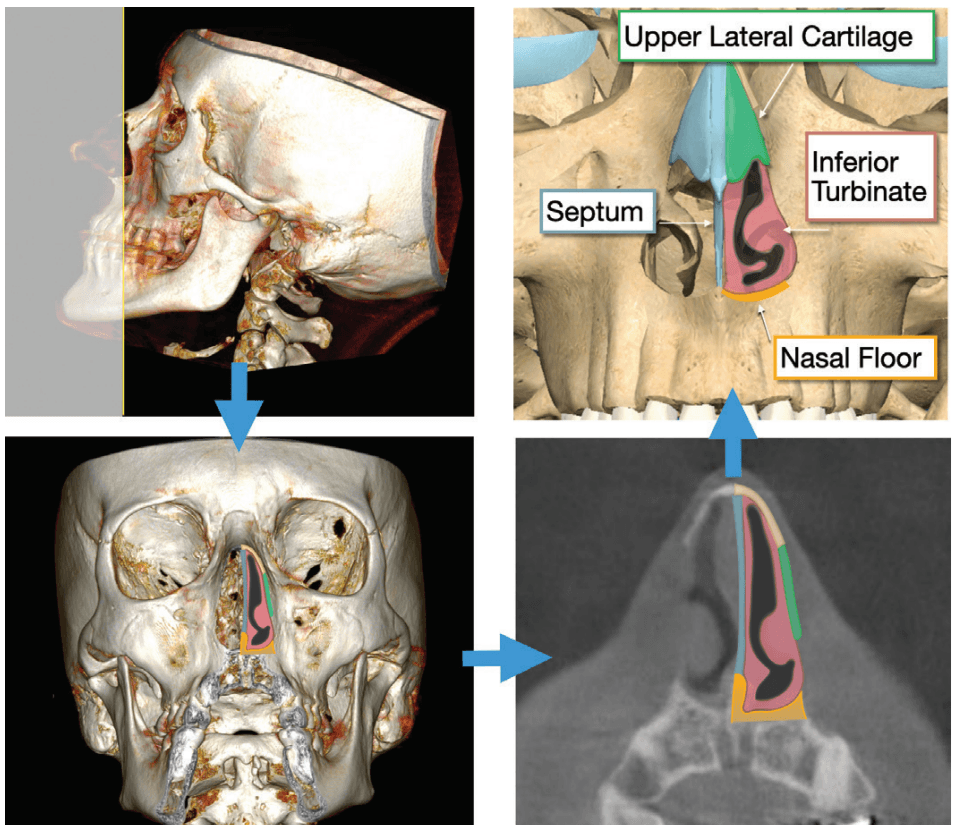 In 2017, Dr. Ryan Williams and Dr. Stanley Liu at Stanford Otolaryngology performed a retrospective case-control study to identify phenotypes of patients who complain of persistent nasal obstruction after surgery.6 Eighty-nine subjects with perioperative validated questionnaires and computed tomography imaging were included. The study showed that patients with persistent nasal obstruction after intranasal surgery (septoplasty, inferior turbinate reduction) presented with a narrower maxilla (and nasal floor), near the region of the internal nasal valve.