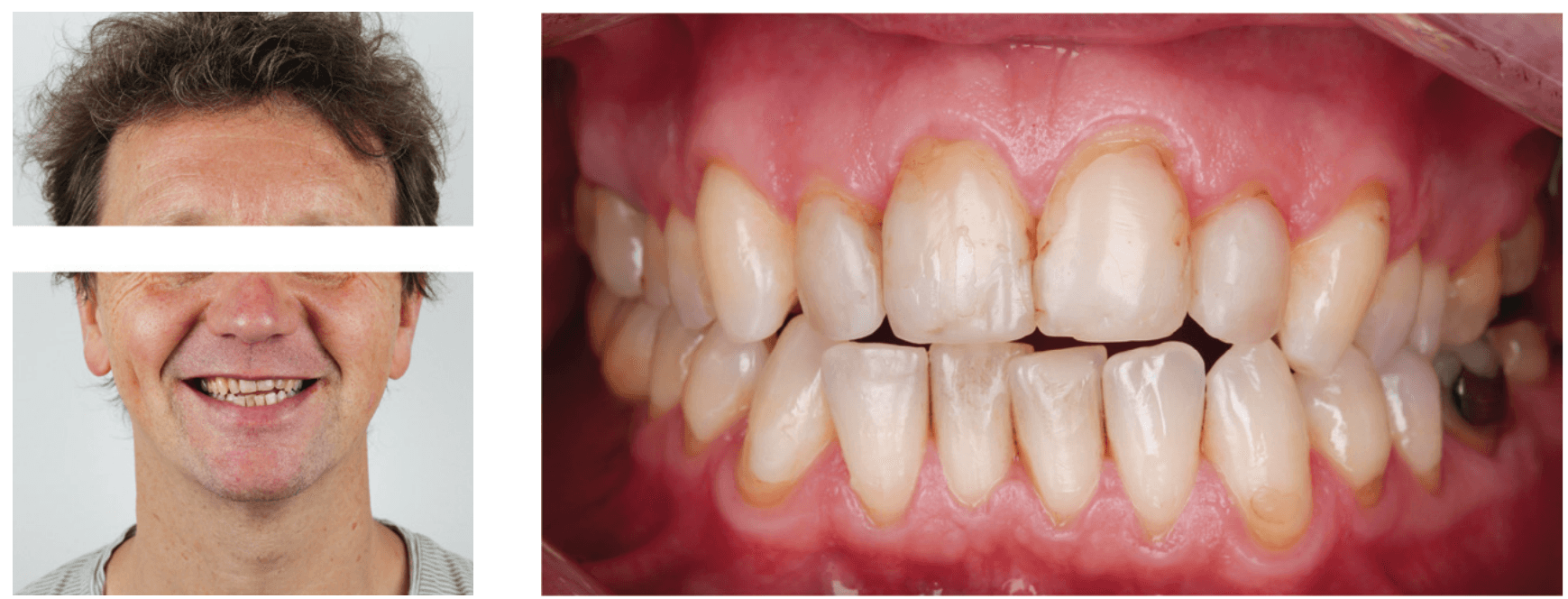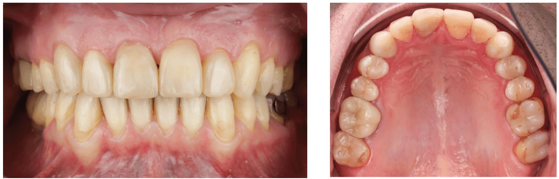 A 51-year-old male was referred by the treating dentist to address malocclusion before doing extensive restorative work. The patient presented equal facial thirds and pronounced buccal corridors. Intraorally, the teeth presented in Class I, with an anterior open bite, a narrow upper jaw, and a high-arched palate.
