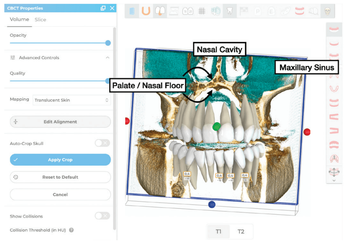 To ensure predictable suture separation of the maxillary halves, minimally invasive osteotomies were performed (Periodontist: Dr. Christian Leonhardt). During the same appointment, four mini-screws were placed: two in the anterior palate (Benefit PSM Medical, 2 mm x 11 mm) and two between the roots of the second premolar and first molar (Benefit PSM Medical, 2 mm x 13 mm). Surgical guides were used to place the mini-screw in areas with sufficient bone and navigate from the roots. An intraoral scan was then taken to produce a custom-made expander that could be mounted onto the bone screws.