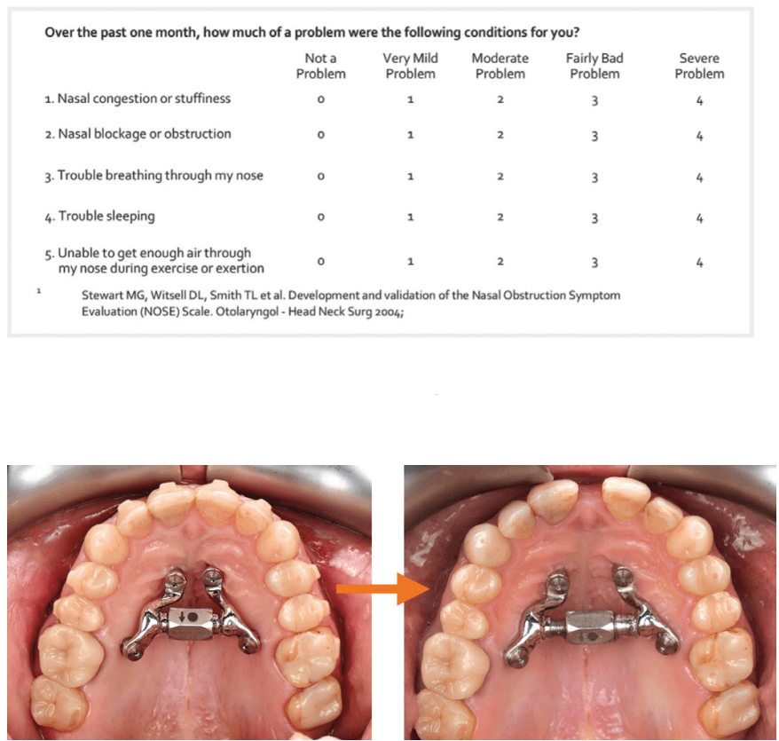 After maxillary expansion, the mother reported that the patient’s breathing during sleep had become silent and that she now slept with her mouth closed. Additionally, the patient’s NOSE score improved from 6/20 to 0/20 — indicating a significant improvement in nasal breathing. The patient also noted that she previously woke up during the night, but this ceased after orthopedic expansion of the maxilla.