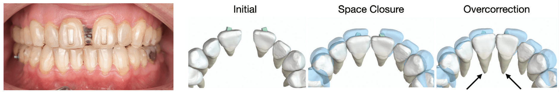 The initial setup in the aligners software (Spark™ Approver™) yielded an esthetically pleasing result, with ideal incisor inclination. While aligners generally perform well in expressing root movements, clinicians should anticipate that not all lingual root torque will be fully expressed in the upper incisors. To prevent retroclination and a steep interincisal angle, an additional 10° of palatal root torque should be incorporated into the ideal inclination.