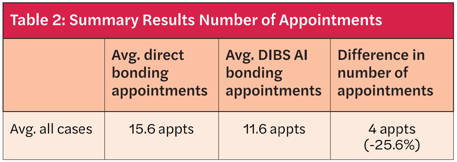 Using data stored in each practice’s Patient Management System (PMS), information on treatment lengths and number of appointments was collected and aggregated for both direct and digital bonding cases.